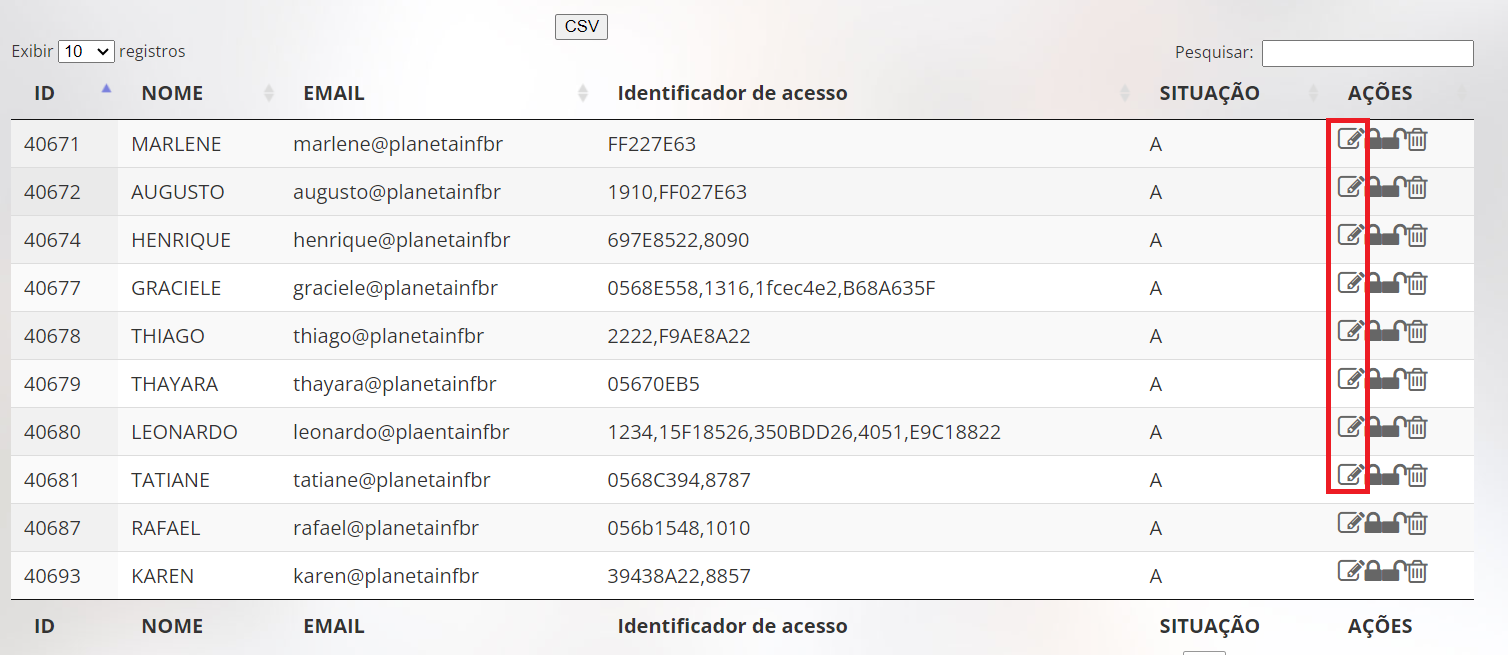 - Clicar em Edit (marcado em vermelho na primeira imagem abaixo) nas opções Ações do Usuário localizado;